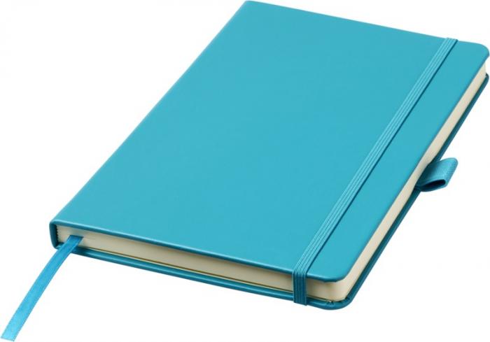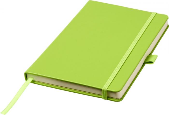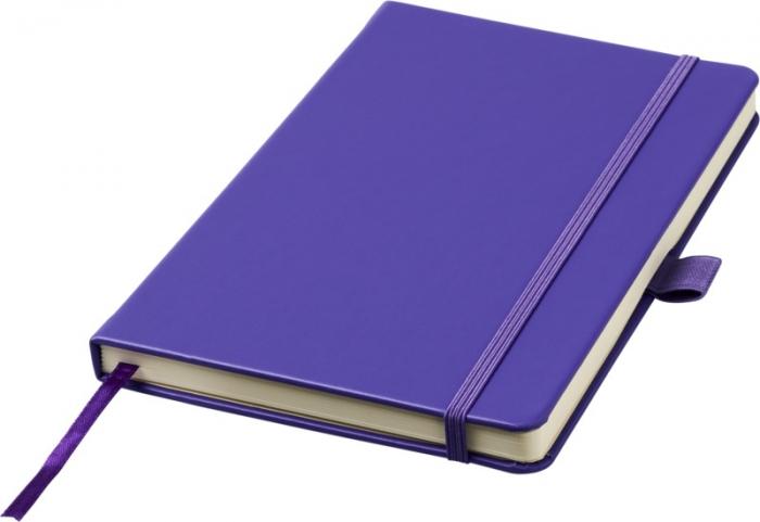 Em pele sintética, com fita elástica, marcador de fita, presilha para caneta e bolso traseiro em acordeão.